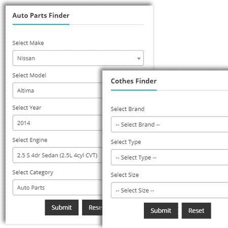 Easily add a custom product finder to your store (for example Make, Model, Year finder for an auto-part store). This module supports unlimited dropdowns. You can easily assign combinations to your products and use export and import to update multiple products at once.