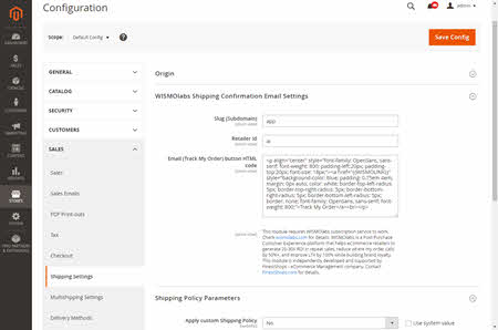 - Go to Stores -> Configuration -> Sales -> Shipping Settings -> WISMOlabs Shipping Confirmation Email Settings